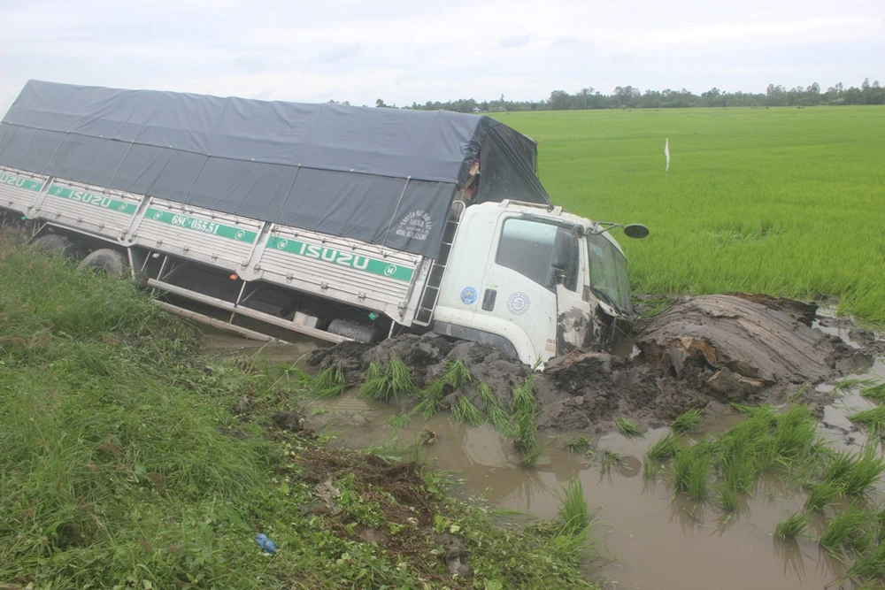 Đầu xe tải cắm xuống ruộng lúa (ảnh KHÁNH HOÀNG)