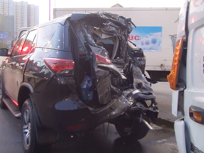 Cú tông với lực tác động mạnh đã khiến xe ô tô 7 chỗ bị đẩy đi khoảng 10 m trên đường; phần đuôi bị biến dạng, hư hỏng nặng. Những người trên xe hoảng loạn, la hét. Hai người trên xe Fortuner bị thương phải nhập viện cấp cứu.