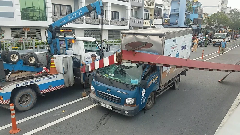 Chiều 11-10, xe tải biển số 51C-578.82 chạy trên đường Nguyễn Văn Luông hướng từ vòng xoay Phú Lâm ra đường Võ Văn Kiệt với tốc độ nhanh. Trong lúc băng qua hầm chui cầu Phạm Văn Chí (quận 6, TP.HCM) thùng xe vướng vào thanh giới hạn chiều cao.