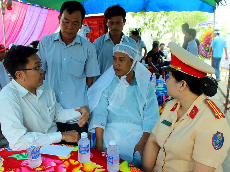 Ông Nguyễn Vũ Hạnh Phúc, Chánh Văn phòng Ban ATGT TP (trái) và Trung tá Lê Huỳnh Như, Phó Đội trưởng Đội CSGT-TT quận 12 (phải) thăm hỏi gia đình các nạn nhân. Ảnh: LÊ THOA