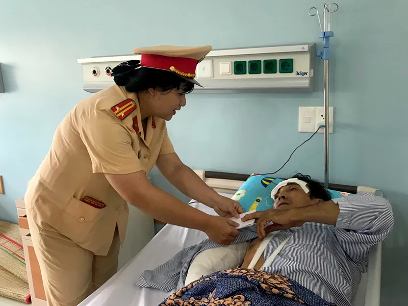 Trung tá Lê Huỳnh Như, Phó Đội trưởng Đội CSGT-TT quận 12, thăm và trao 3 triệu đồng hỗ trợ anh Nguyễn Chí Tâm đang điều trị tại BV 175. Ảnh: LÊ THOA
