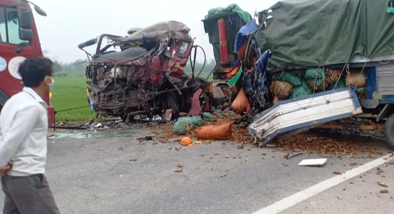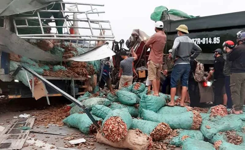 Cú tông mạnh khiến đầu hai xe vỡ nát, nhiều bao tải gừng đổ ra đường, tài xế xe tải và một phụ nữ ngồi trên xe tải tử vong.