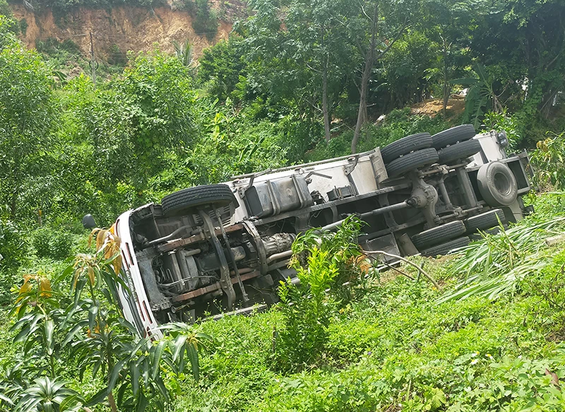 Sau khi tông chết tài xế, chiếc xe tài lật ngửa ven đường. Ảnh: NO