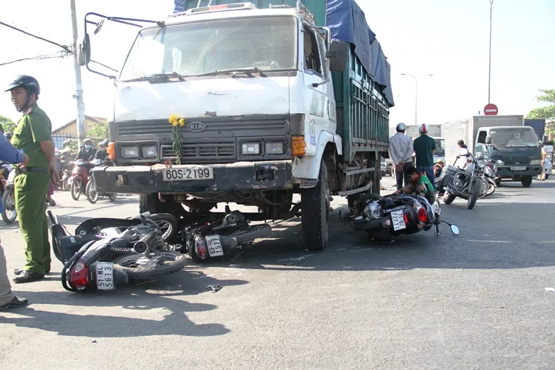 Nhiều xe máy đã bị cuốn vào gầm xe tải.