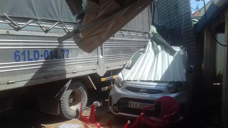 Cú tông bất ngờ khiến xe tải cuốn một xe máy chạy phía trước và một xe máy dựng bên lề đường vào gầm xe. Không dừng lại ở đó xe tải tiếp tục lao vào quán ăn bên đường húc đổ mái hiên quán ăn và đè nát một ô tô du lịch trong quán.