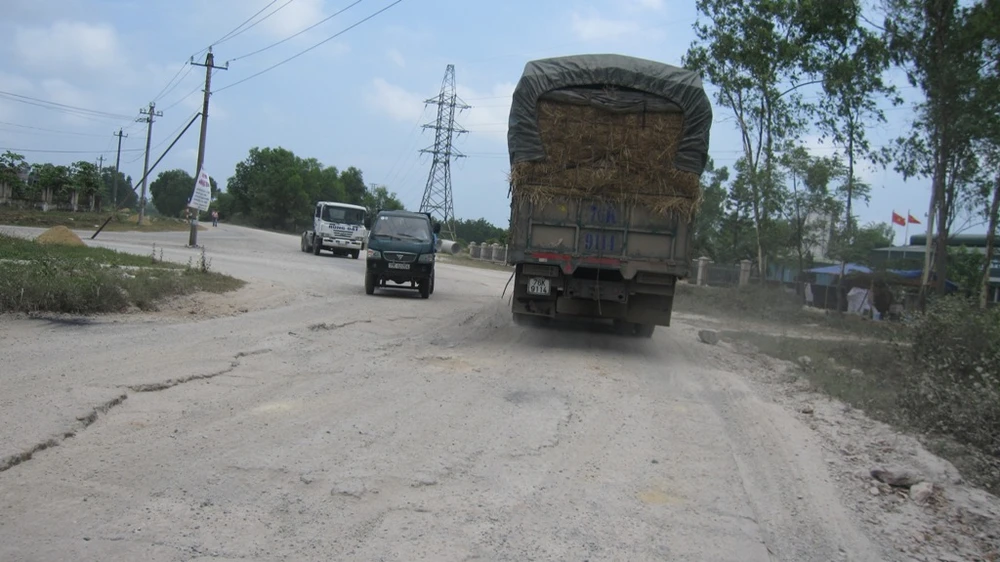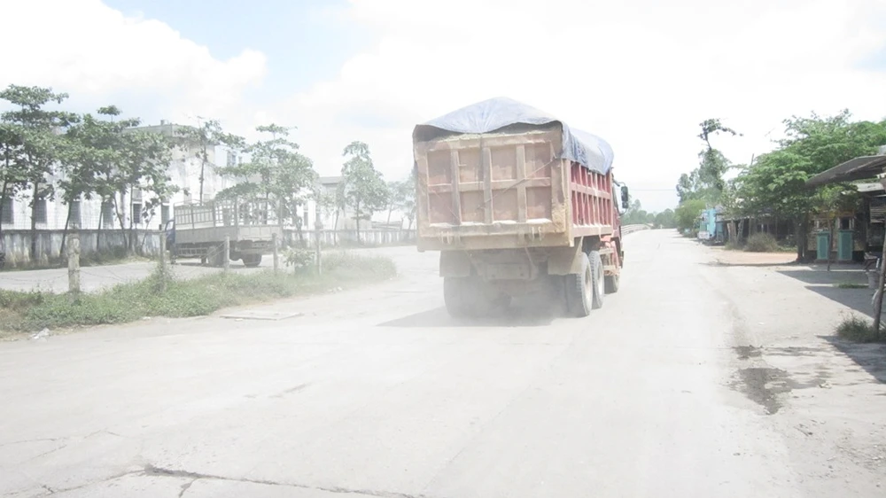 Khoảng 10 giờ, từng đoàn xe quá tải nối đuôi nhau ùn ùn men theo đường nội thị này làm cho đoạn đường được xây bằng bê tông rung lên như có động đất.
