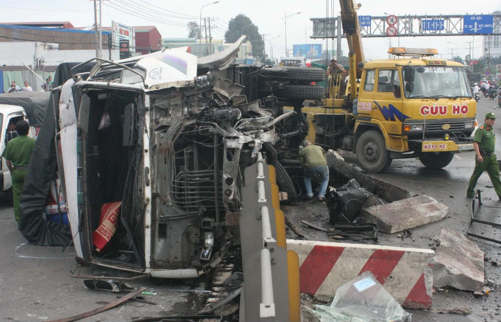 Vụ tai nạn nghiêm trọng xảy ra vào khoảng 5 giờ 30 ngày 7-11, ngay chân cầu vượt Amata (quốc lộ 1A, TP Biên Hòa, Đồng Nai) khiến xe tải và xe container bị hư hỏng nặng.