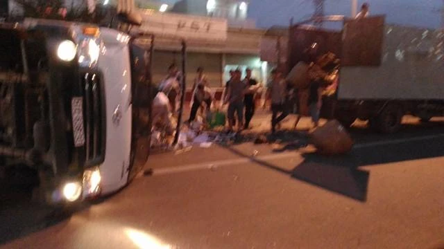 Theo thông tin bạn đọc vừa gửi về cho chúng tôi, chiếc xe tải này đang lưu thông thì xảy ra va chạm với hai xe máy và bị lật, chắn ngang giữa đường. Hai xe máy chỉ bị ngã, còn người đi xe thì may mắn không bị gì.
