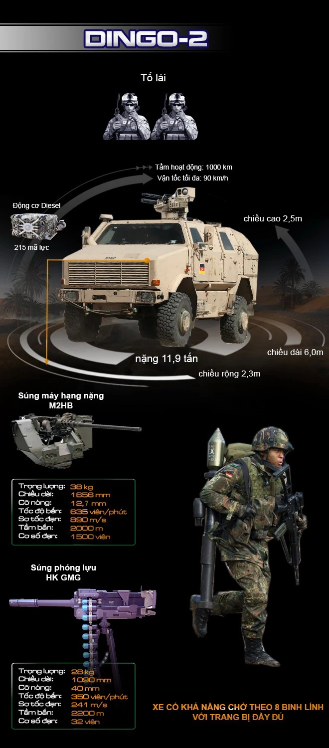 Xe thiết giáp đa năng ATF Dingo-2 do Tập đoàn Krauss-Maffei Wegmann của Đức chế tạo, nó đã được triển khai tới những chiến trường nóng bỏng nhất hành tinh. Chiếc xe có đáy hình chữ V, chống chịu tốt trước các loại mìn hay vật liệu nổ tự chế (IED). Thân xe bọc giáp MEXAS, "miễn nhiễm" đối với đạn xuyên thép cỡ nòng nhỏ.