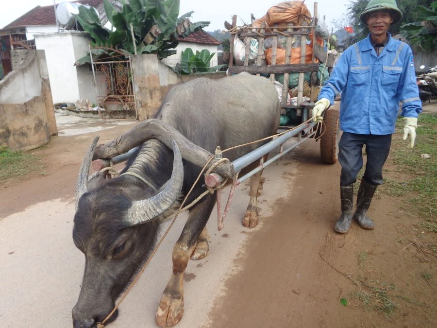 Một hình ảnh đẹp và ấn tượng khác là hình ảnh chở rác bằng … xe trâu. Để thôn xóm sạch đẹp, người dân không phải vứt rác bừa bãi mà chỉ cần bỏ rác trước cổng là có xe trâu đến nhận. Xe trâu là phương tiện thô sơ, dễ luồn lách đi vào các hẻm nhỏ, không xả thải nhiên liệu và tiếng ồn nên không gây ô nhiễm môi trường…