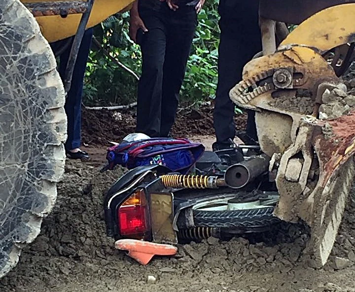 Theo thông tin ban đầu, chị Hồ Thị Thu Cúc điều khiển xe máy 86K8-1172 chở con trai 12 tuổi, đã va chạm với xe ủi sỏi đất đang thi công trên tuyến đường trên.