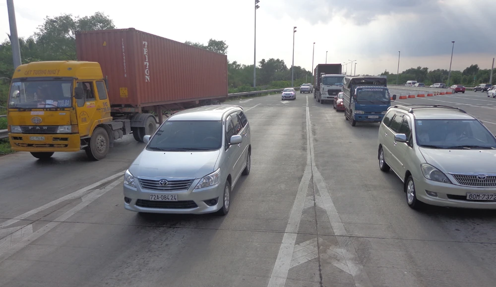 Lúc 16 giờ chiều 4-9, các dòng xe từ hướng Đồng Nai vượt qua cầu Long Thành ùn ùn đổ về phía trạm thu phí Long Phước, quận 9. Do mặt cầu và đường dẫn xuống cầu bó lại chỉ còn hai làn xe nên các xe di chuyển chậm lại với tốc độ trung bình 40 km/giờ.