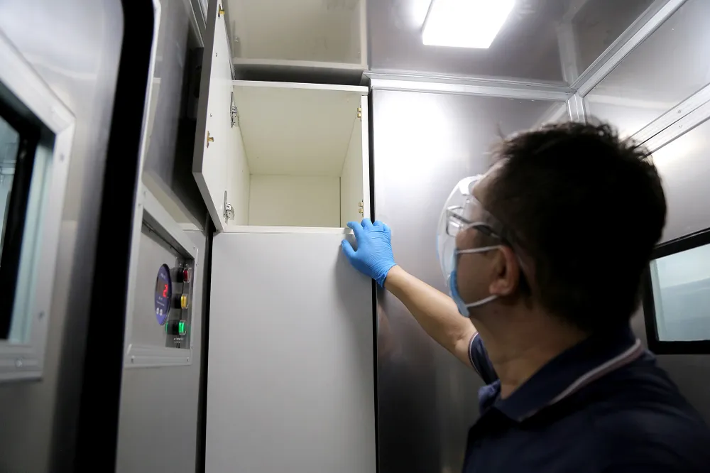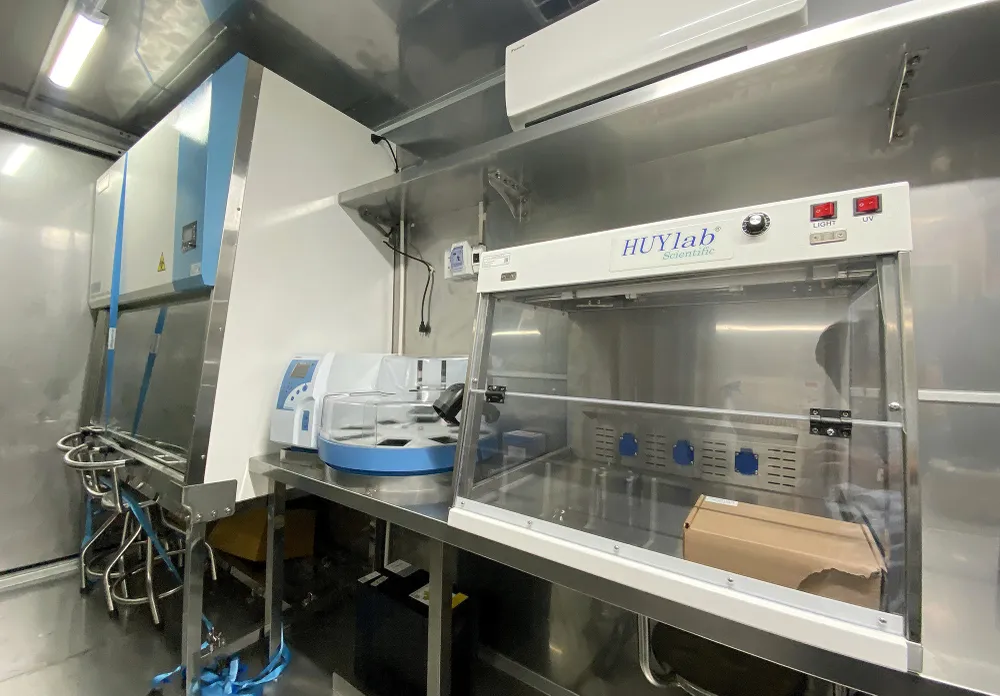 Trang thiết bị phục vụ xét nghiệm bên trong phòng tiếp nhận mẫu và tách chiết của xe lưu động.