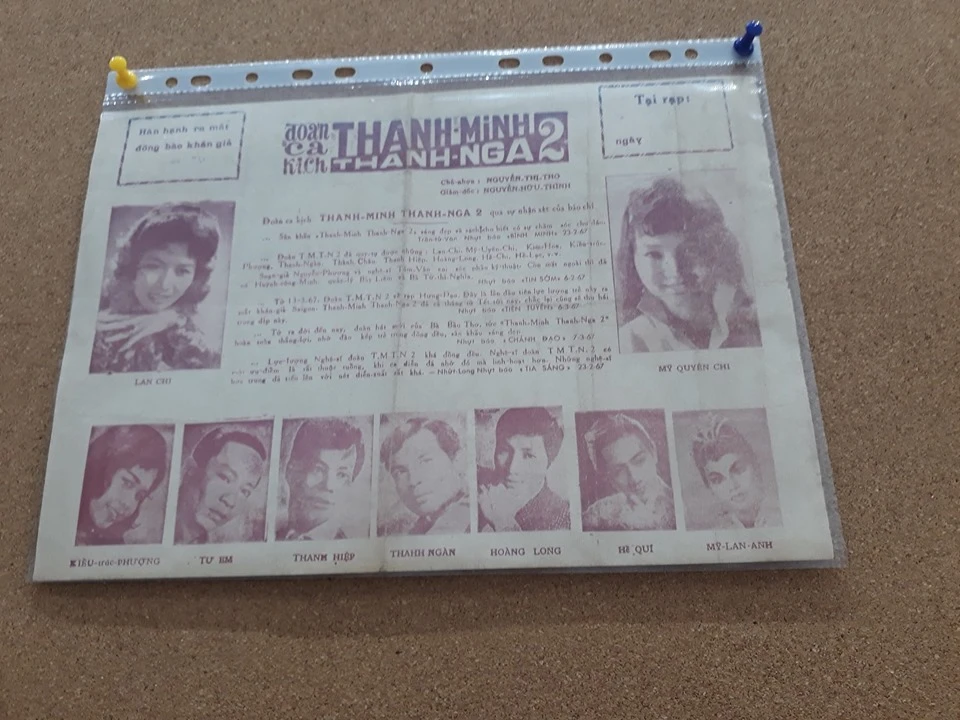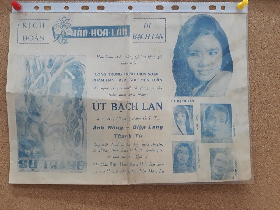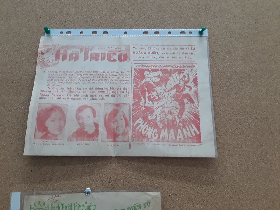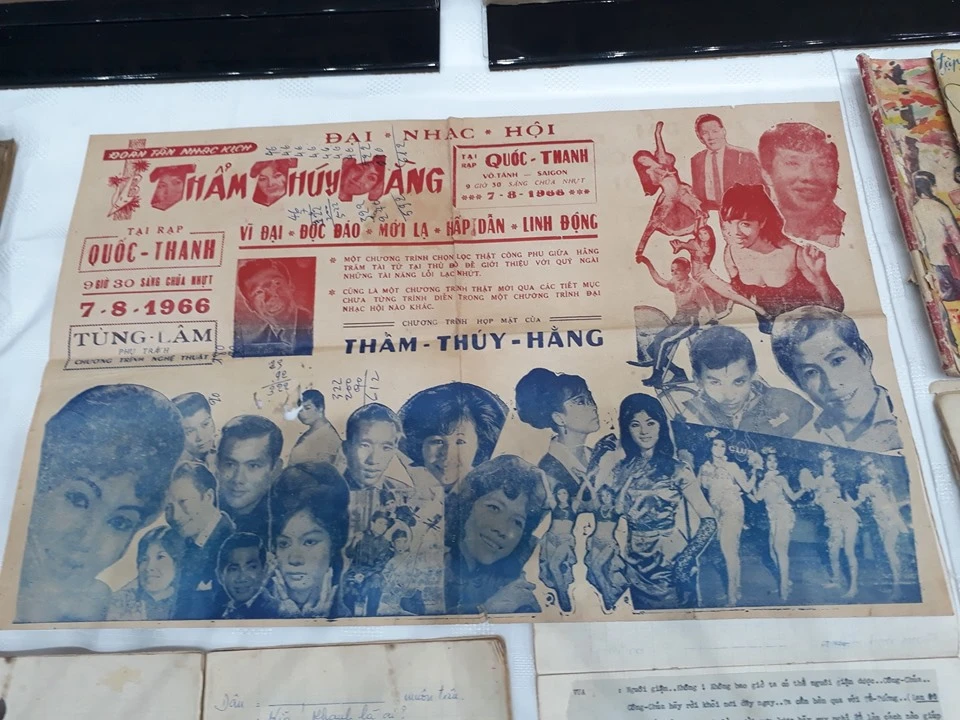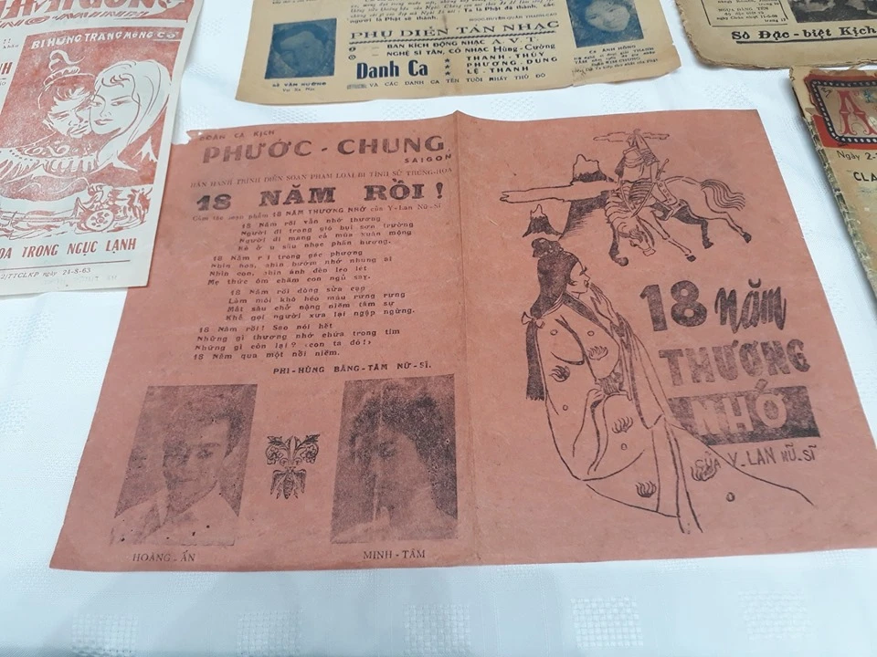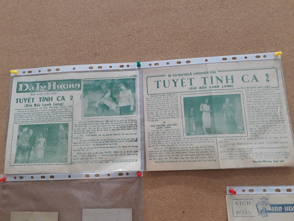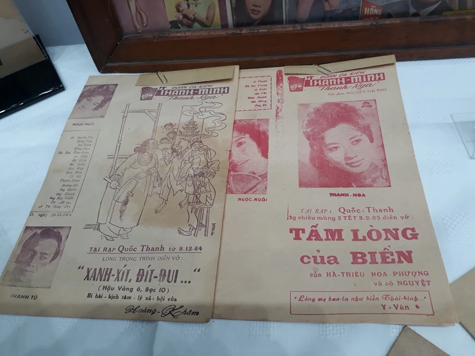 Các hiện vật là những tờ giới thiệu những vở cải lương lừng danh xưa như: Con gái chị Hằng, Hai chiều ly biệt, Tuyệt Tình ca, Má hồng phận bạc... Những tờ giới thiệu các đoàn cải lương lừng danh với những nghệ sĩ tên tuổi như: Thanh Minh Thanh Nga, Kim Chung, Dạ Lý Hương, Út Bạch Lan - Thành Được, Thủ Đô, Thống Nhất, Bạch Tuyết - Hùng Cường, Hương Mùa Thu... Những quyển tuồng cải lương xưa như: Sương mù trên non cao, Mùa thu trên Bạch Mã Sơn, Người tình trên chiến trận, Hoa Mộc Lan tùng chinh… Những quyển tập vở viết tuồng trước 1975 của các nhạc sĩ đoàn hát, của nghệ sĩ có chữ viết tay ghi chú rõ đoạn này đơn ra sao, diễn ra sao, ai diễn, ai hát… Hình ảnh nhiều nghệ sĩ trước 1975. Hình ảnh giải Kim Khánh trước 1975. Những chiếc máy hát dĩa nhựa trước 1975…