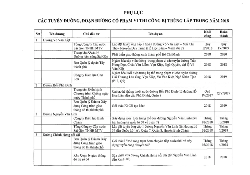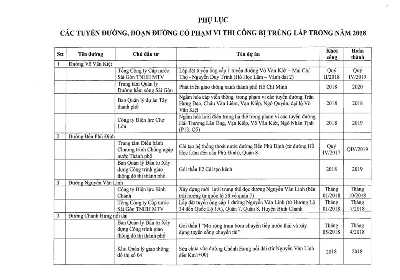 Tổng cộng có 39 tuyến đường ở địa bàn TP.HCM mà mỗi tuyến ít nhất có hai công trình thi công đào đường trong năm 2018. Nơi nhiều nhất có đến bốn công trình thi công trùng lắp.