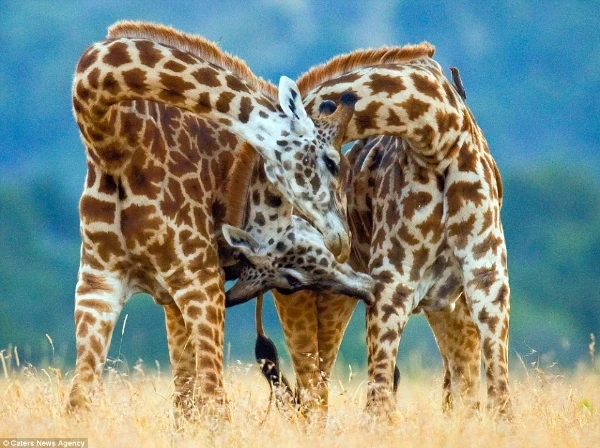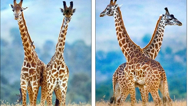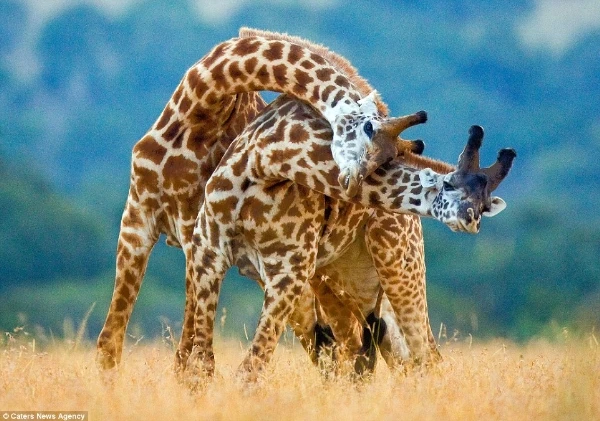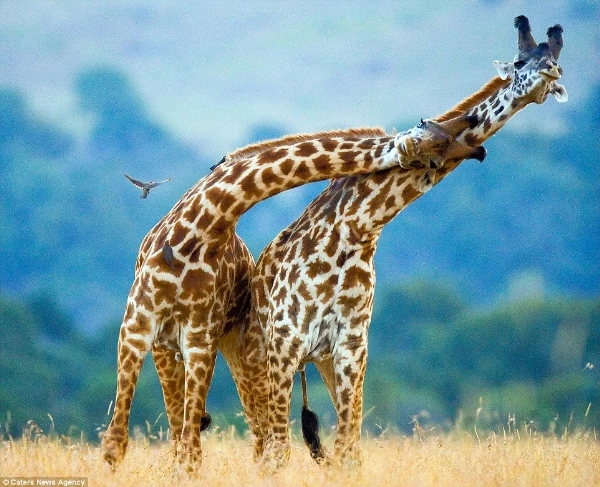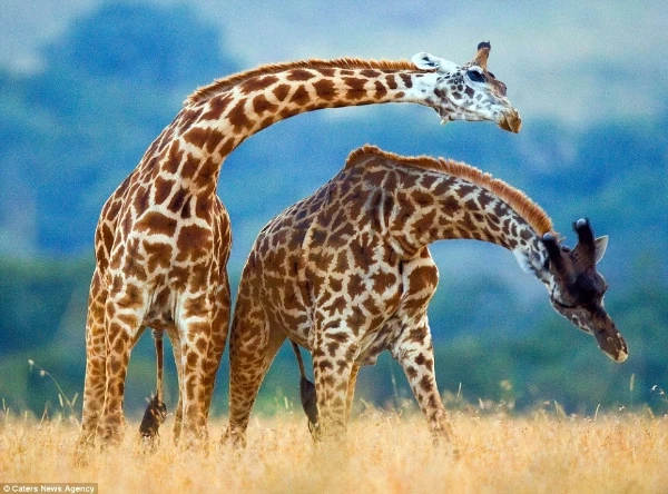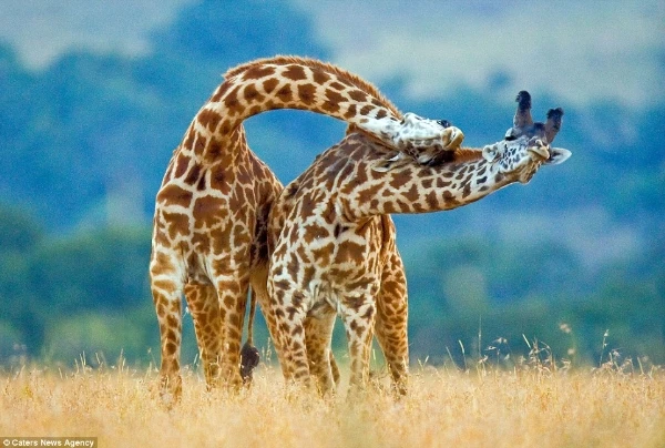 Nhiếp ảnh gia người Nga Andrey Gudkov, 42 tuổi đã may mắn được thưởng thức màn "khiêu vũ" ấn tượng của hai chú hươu cao cổ trên vùng thảo nguyên Maasai Mara, Kenya. Hai chú hươu cao cổ "phiêu" trong điệu nhạc mà không hề biết xung quanh mình có rất đông du khách đang vô cùng thích thú chiêm ngưỡng màn biểu diễn của chúng. Tận dụng lợi thế có chiếc cổ siêu dài, chúng ưỡn cổ ra xa, rồi nhún nhẩy duyên dáng và điệu nghệ như những vũ công chuyên nghiệp.