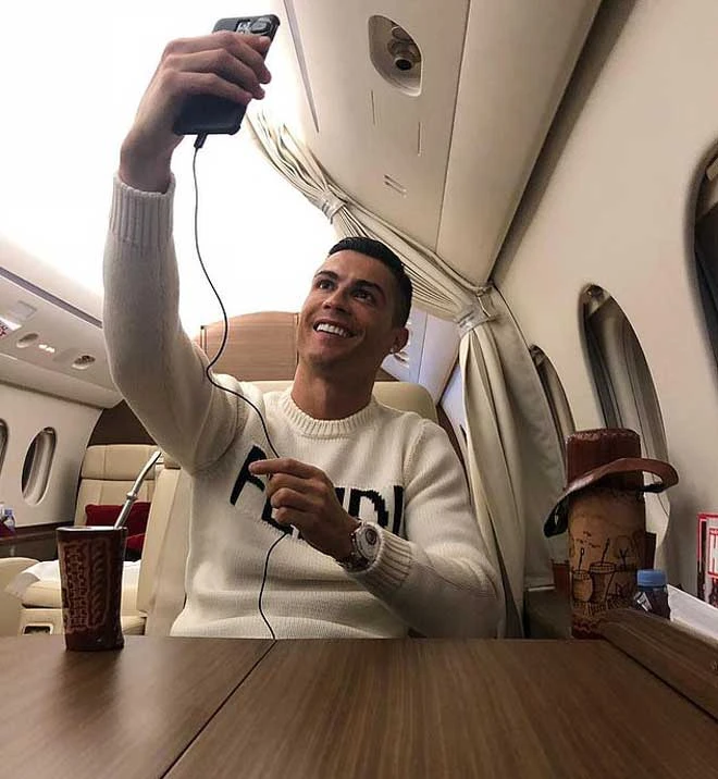 Ronaldo trong máy bay riêng của mình. Ảnh: GETTY IMAGES