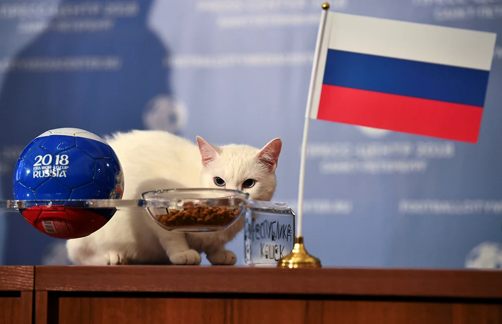 + Trước tiên phải nói về chú mèo đực khiếm thính có tên Achilles của chủ nhà Nga. Achilles sống ở bảo tàng Emitazje, TP St. Petersburg. Qua hai trận đầu của chủ nhà Nga, Achilees đã dự đoán đúng khi Nga đánh bại Saudai Arabia 5-0. Ở trận thứ hai, Achilles đến trước cờ Nga và cờ Ai Cập rồi phân vân sau đó chọn dĩa thứa ăn có cờ Nga. “Chén” gần hết rồi sang dĩa thức ăn có cờ Ai Cập “chén” thêm một tí nữa. Mọi người diễn giải, Ai Cập ghi bàn nhưng Nga thắng. Chính xác.