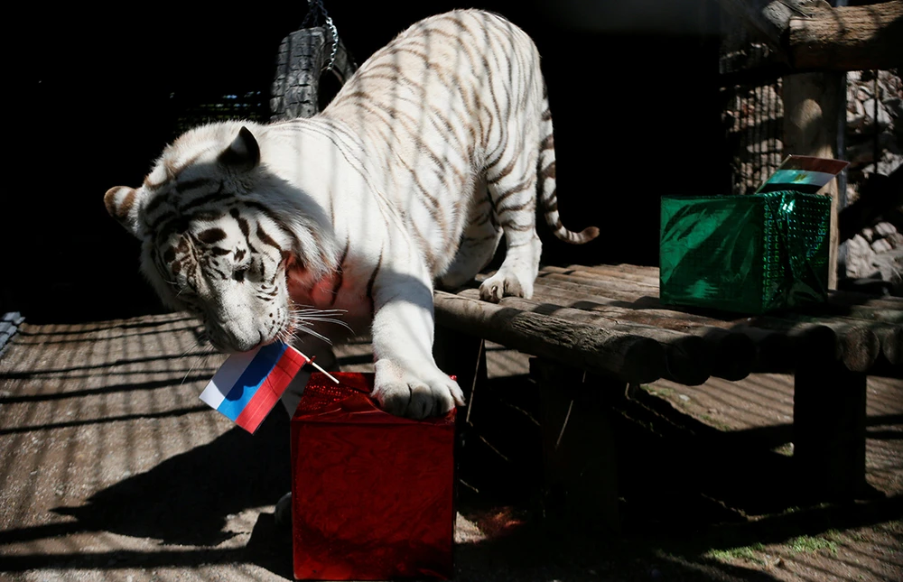 + Khan là tên của chú hổ trắng Bengal ở vườn bách thú Royev Ruchey, TP Krasnodar (Nga) là người dự đoán đúng cả hai trận Nga thắng Saudi Arabia và Ai Cập.