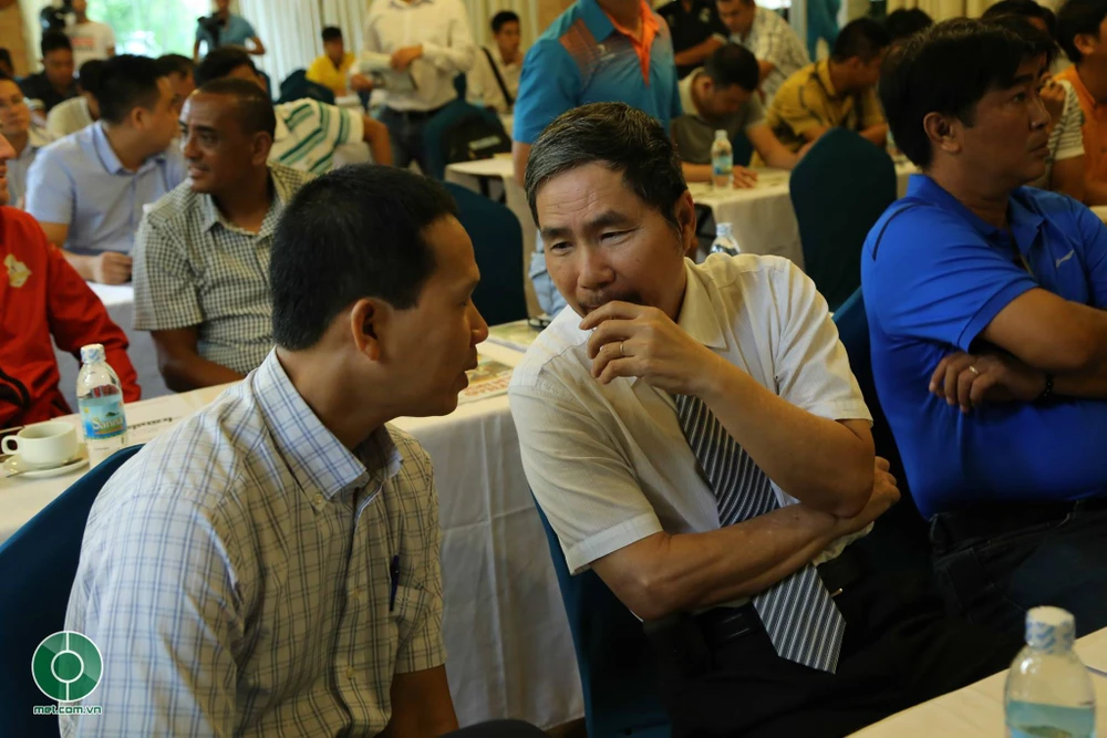 Cựu danh thủ Trần Minh Chiến (áo xanh) cùng cựu Phó Tổng Thư ký VFF Dương Nghiệp Khôi (giữa).