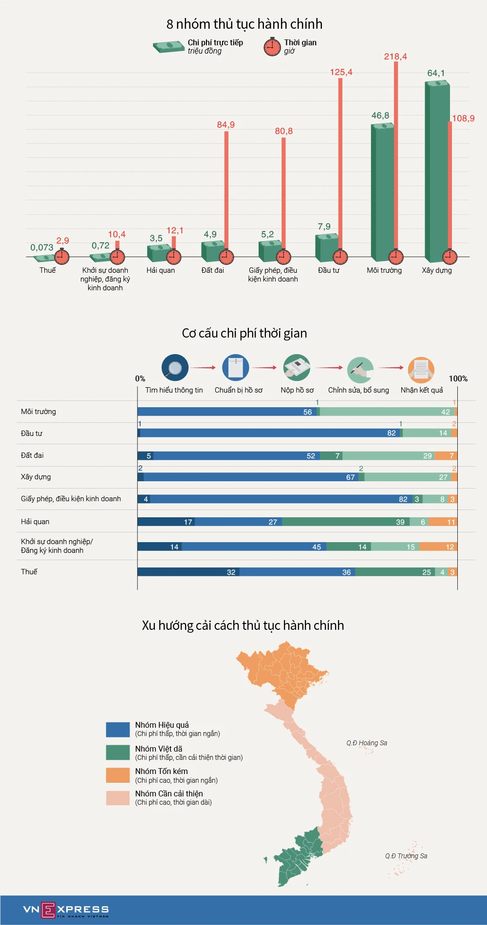 Thủ tục xây dựng chi phí đắt đỏ nhất với 64 triệu đồng, còn thủ tục môi trường tốn nhiều thời gian nhất với hơn 218 giờ thực hiện.