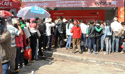 Dòng người xếp hàng nhận vé máy bay giá 0 đồng.