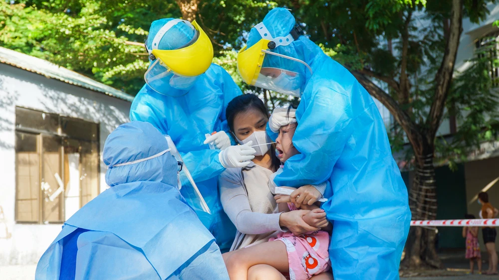 Do lo ngại về tình hình dịch bệnh trong TP, các em nhỏ cũng được phụ huynh dẫn đi lấy mẫu xét nghiệm.