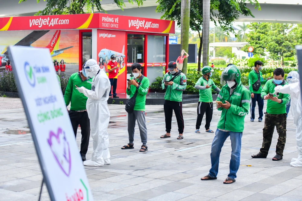 Các shipper xếp hàng trật tự chờ đến lượt xét nghiệm