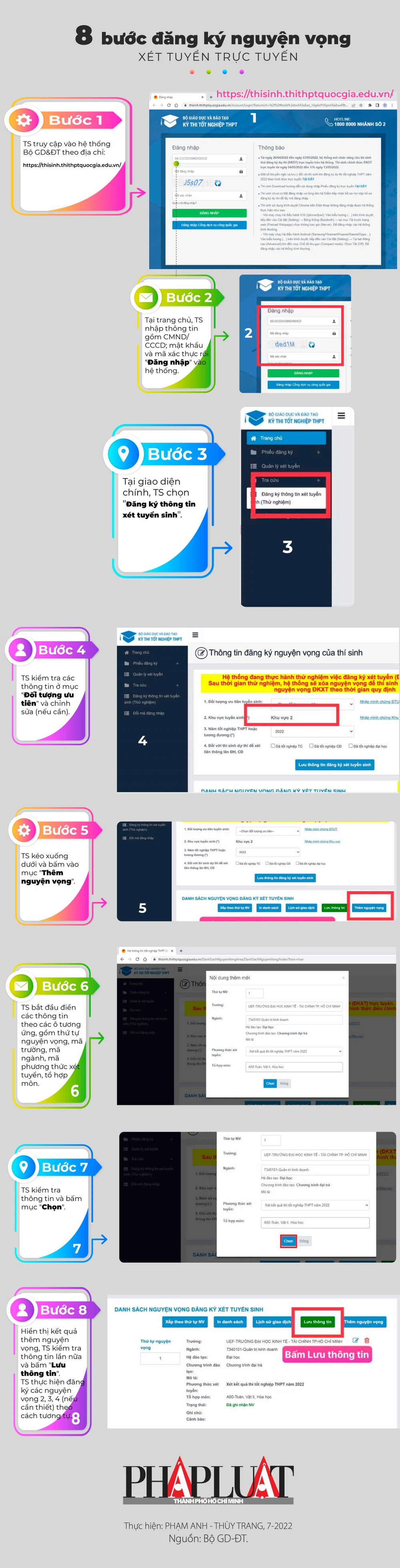 (PLO)- Từ 22-7, thí sinh (TS) trên cả nước sẽ bắt đầu đăng ký, điều chỉnh và bổ sung nguyện vọng (NV) xét tuyển đại học theo hình thức trực tuyến. Đây là năm đầu tiên Bộ GD&ĐT thực hiện đăng ký và lọc ảo chung bằng hệ thống phần mềm cho tất cả các phương thức xét tuyển. Do đó, TS cần cẩn trọng từng bước trong quá trình đăng ký để tránh sai sót đáng tiếc.