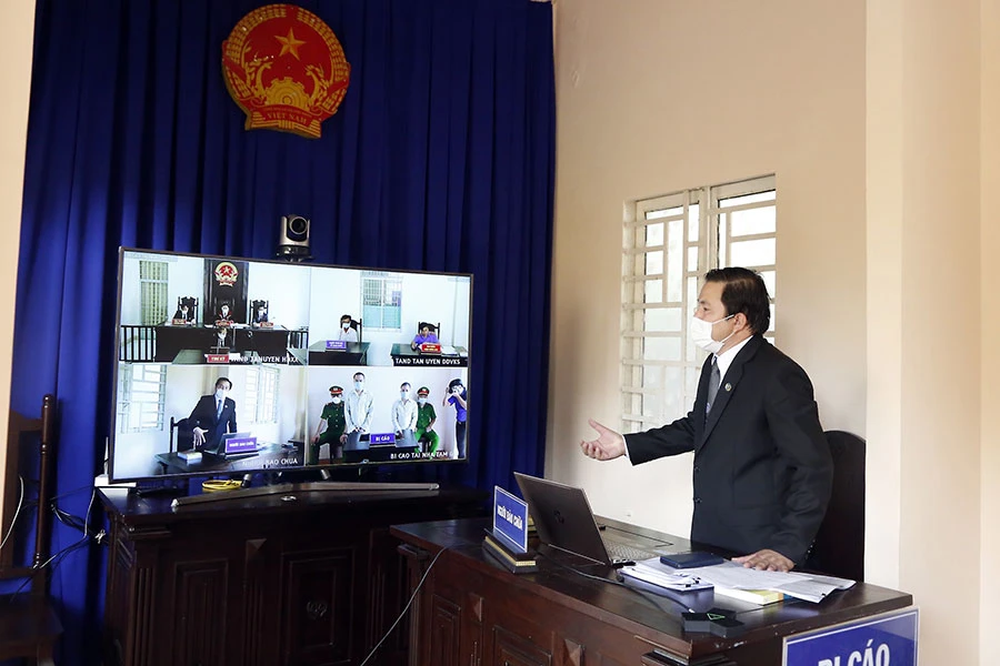 Phiên xử được trang bị màn hình trực tuyến có bốn khung hình zoom tại hai đầu cầu gồm HĐXX cùng thư ký; đại diện VKS, người tham gia tố tụng khác; người bào chữa (luật sư) và bị cáo.