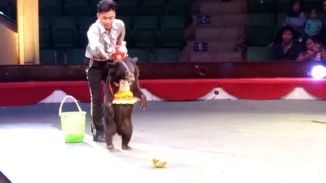 Hình ảnh cá thể gấu ngựa con không rõ nguồn gốc biểu diễn xiếc được khán giả quay lại video clip. Ảnh cắt từ clip.