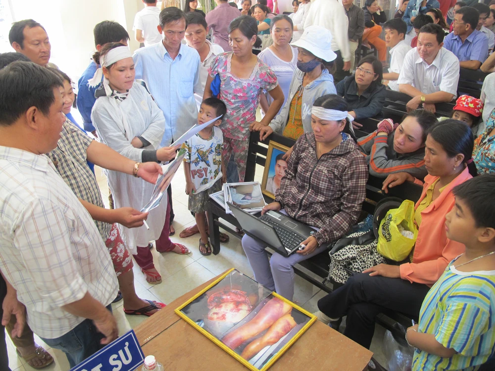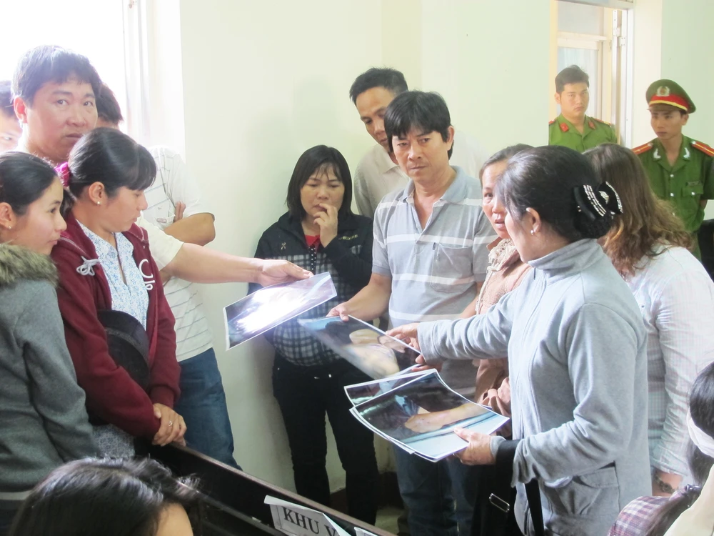 Trong giờ nghỉ giải lao, người dân chuyền tay những hình ảnh về các vết thương trên thi thể anh Kiều khi khám nghiệm tử thi