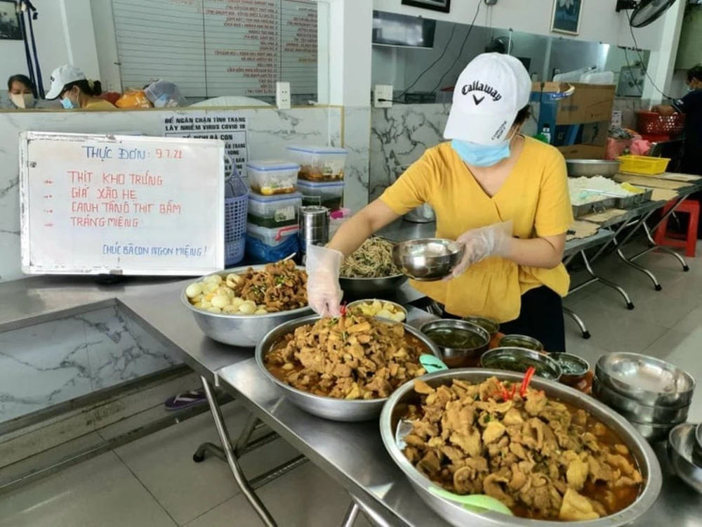 Chính quyền địa phương cử đại diện đến nhận cơm tại bếp cơm từ thiện để đi phát tại các điểm cách ly, hộ dân có hoàn cảnh khó khăn.