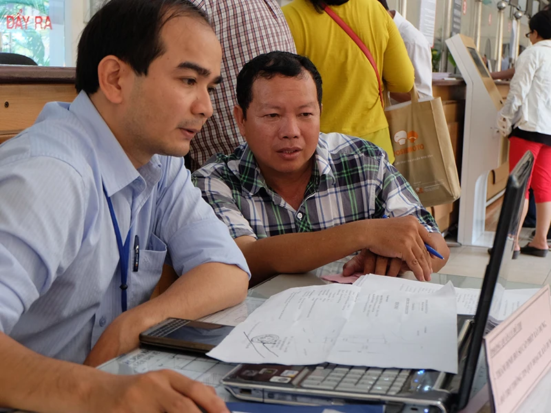Cùng việc ứng dụng công nghệ thông tin, Bình Thạnh vẫn bố trí cán bộ hướng dẫn trực tiếp cho người dân đến làm thủ tục xin phép xây dựng tại phòng Tiếp nhận và trả kết quả. Ảnh: VIỆT HOA