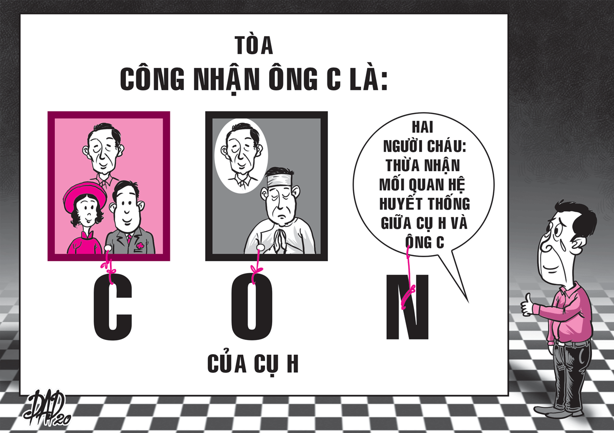 | Phán quyết của tòa phù hợp pháp luật Thông tư số 04/2020 thay thế thông tư số 15/2015 của Bộ Tư pháp (quy định chi tiết thi hành Luật hộ tịch), không còn qui định thư từ, phim ảnh, băng, đĩa... là chứng cứ chứng minh mối quan hệ cha con, mẹ con. Do vậy, ảnh cưới và ảnh đám tang mà ông C. cung cấp cho tòa án được bị đơn thừa nhận chỉ là tài liệu liên quan để tòa đánh giá. Chứng cứ từ lời khai, thừa nhận của hai người cháu nội và con dâu út cụ H. trong vụ kiện trước đó là nguồn chứng cứ quan trọng để xác định cụ H là cha của ông C. Phía các bị đơn không hợp tác cung cấp mẫu để giám định gen dù ông C. đã trưng cầu giám định, nộp chi phí giám định là gây khó khăn cho thu thập chứng cứ khoa học xác định AND. Nhưng việc không hợp tác này của bị đơn lại tạo niềm tin cho thẩm phán. Vì vậy, tòa án chấp nhận yêu cầu của ông C. là hoàn toàn phù hợp, đúng qui định của pháp luật. Tuy nhiên, nếu tòa thuyết phục được bị đơn hoặc người cháu nội cho giám định ADN từ mẫu của ông C. để xác định mối quan hệ huyết thống thì đây là chứng cứ khoa học thuyết phục hơn. Luật sư TRẦN CHẤN HOÀNG, Đoàn Luật sư TP Cần Thơ |