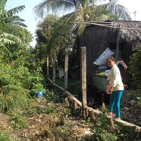 Chị ông Lưu đứng trên ranh đất của gia đình và cột hàng rào đã được xây từ lâu. Ảnh: NGUYỄN HIỀN.