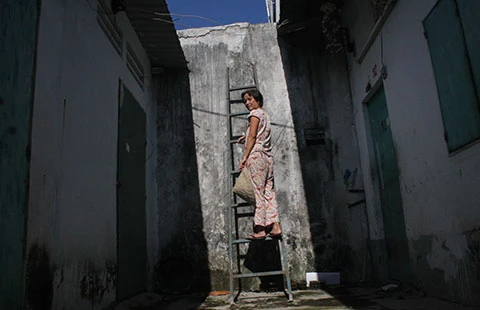 Vì không thể đi theo hướng bị tường mới xây che chắn, người dân tìm lối khác thì cũng phải bắc thang để trèo qua tường. Ảnh: VN
