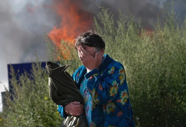 Một người phụ nữ bật khóc bên ngoài ngôi nhà của bà đang bị cháy bì bom đạn ở thành phố Donetsk. Ảnh: AP
