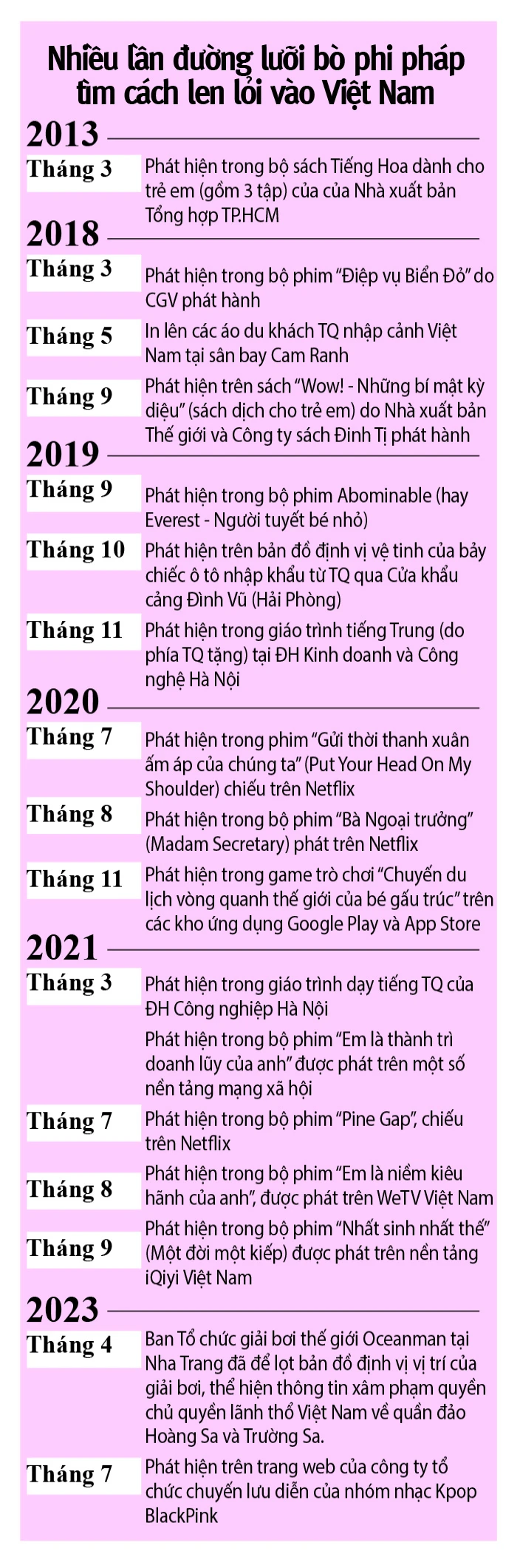 Câu chuyện Trung Quốc (TQ) đưa bản đồ đường lưỡi bò phi pháp vào các sản phẩm thông tin, truyền thông… không phải mới. Kể từ hơn chục năm trước, Việt Nam phát hiện hàng loạt vụ sách báo, truyện thiếu nhi, sách giáo khoa, quả địa cầu, trò chơi điện tử, các ấn phẩm du lịch, quần áo… có in bản đồ đường lưỡi bò này.