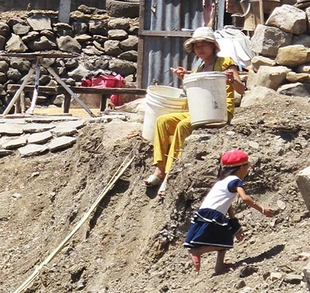 Trẻ em, người lớn đều phải leo lên leo xuống hố sâu để vào nhà. (Ảnh chụp tại xã Xuân Thọ, thị xã Sông Cầu, (Phú Yên) Ảnh: TẤN LỘC