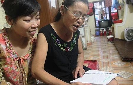 Chị Nhung (trái) và bà Phan Thị Gấm cùng đọc một bài thơ vừa mới sáng tác. Ảnh: V.THỊNH
