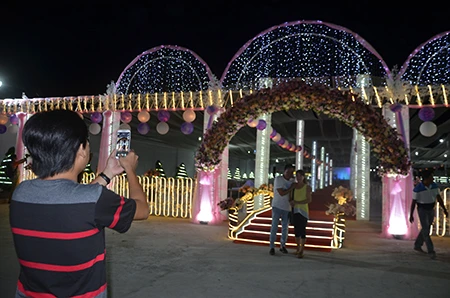Người dân địa phương tranh thủ chụp hình ngay rạp cưới "có một không hai" vào đêm nhóm họ.