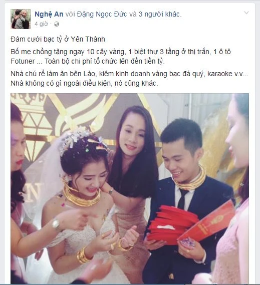 Hai ngày nay (20-8), trên trang facebook Nghệ An đăng hình ảnh cô dâu chú rể trên tay cầm giấy chứng nhận quyền sử dụng đất và quà mừng, đeo vàng cho cô dâu với chú thích: "Đám cưới bạc tỉ ở Yên Thành. Bố mẹ chồng tặng ngay 10 cây vàng, một biệt thự 3 tầng ở thị trấn, một xe ô tô...toàn bộ kinh phí tổ chức lên đến tiền tỉ...".