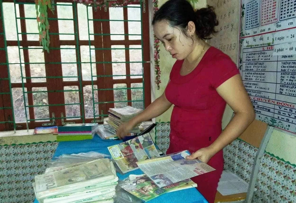 Tranh thủ giờ nghỉ, cô giáo bọc lại sách vở cho các em học sinh.