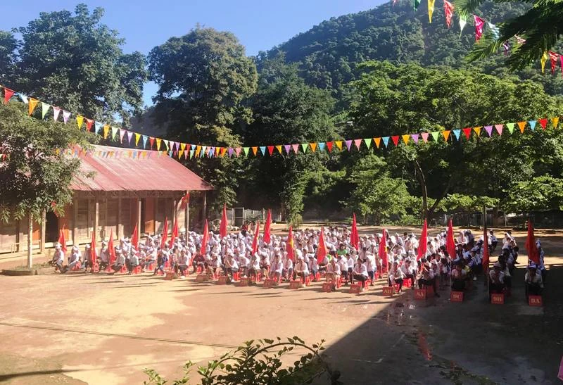 Vượt lên khó khăn, thầy cô giáo đã tổ chức lễ khai giảng cho các em học sinh một cách trang trọng.