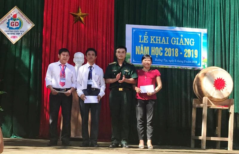Đại diện đồn biên phòng tặng quà cho các trường học trong buổi lễ khai giảng.