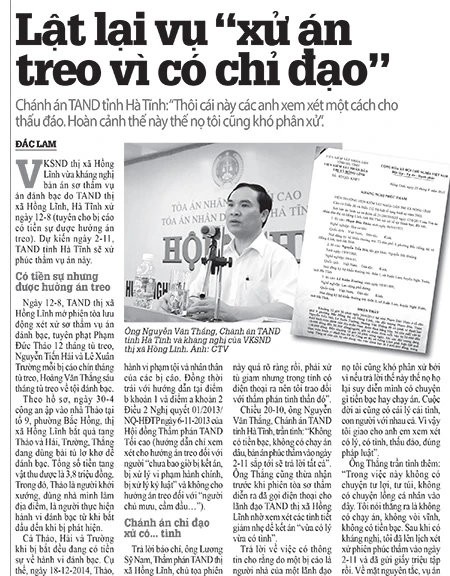 “Bản án sơ thẩm bị VKSND thị xã Hồng Lĩnh kháng nghị là hoàn toàn chính xác, có căn cứ pháp luật rất rõ ràng” - ông Đinh Văn Quế (nguyên Chánh Tòa Hình sự TAND Tối cao) cũng nhận xét. Theo ông Quế, trách nhiệm sửa cái sai của tòa sơ thẩm lúc này thuộc về TAND tỉnh Hà Tĩnh. “Vụ việc đã bị phanh phui ra công luận nên tôi bảo đảm rằng trong phiên xử phúc thẩm sắp tới, có các vàng thì TAND tỉnh Hà Tĩnh cũng không dám y án sơ thẩm, cho ba bị cáo Thảo, Hải, Trường hưởng án treo nữa đâu” - ông Quế dự đoán.