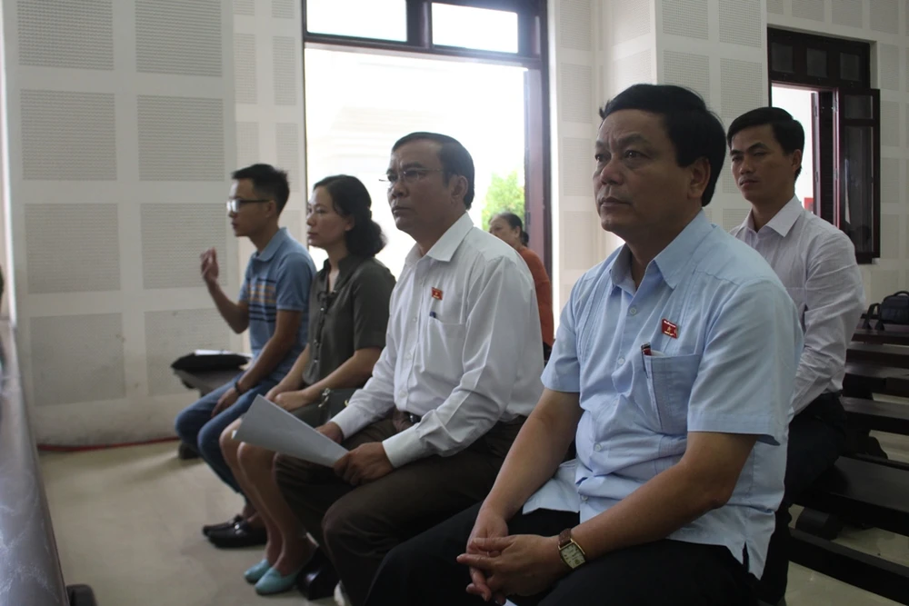 Phiên tòa sáng nay có có mặt Phó trưởng đoàn ĐBQH TP Đà Nẵng Nguyễn Bá Sơn (áo trắng) và Trưởng đoàn ĐBQH tỉnh Quảng Trị Hoàng Đức Thắng (áo xanh).