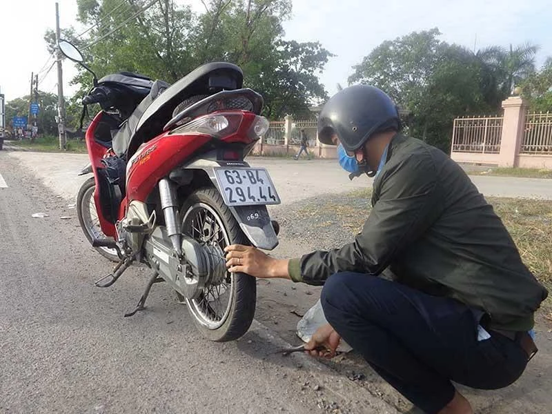 Một nạn nhân cán trúng đinh hình tam giác trên quốc lộ 51 (xã Tam Phước, TP Biên Hòa, Đồng Nai) hồi tháng 1-2019. Ảnh: VŨ HỘI