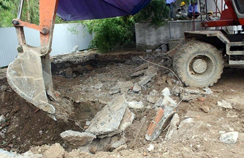 Lực lượng chức năng khai quật hố chôn hóa chất độc hại tại Công ty Nicotex Thanh Thái (tháng 10-2013). Công ty này đã bị phạt hành chính hơn 421 triệu đồng. Ảnh: LAO ĐỘNG